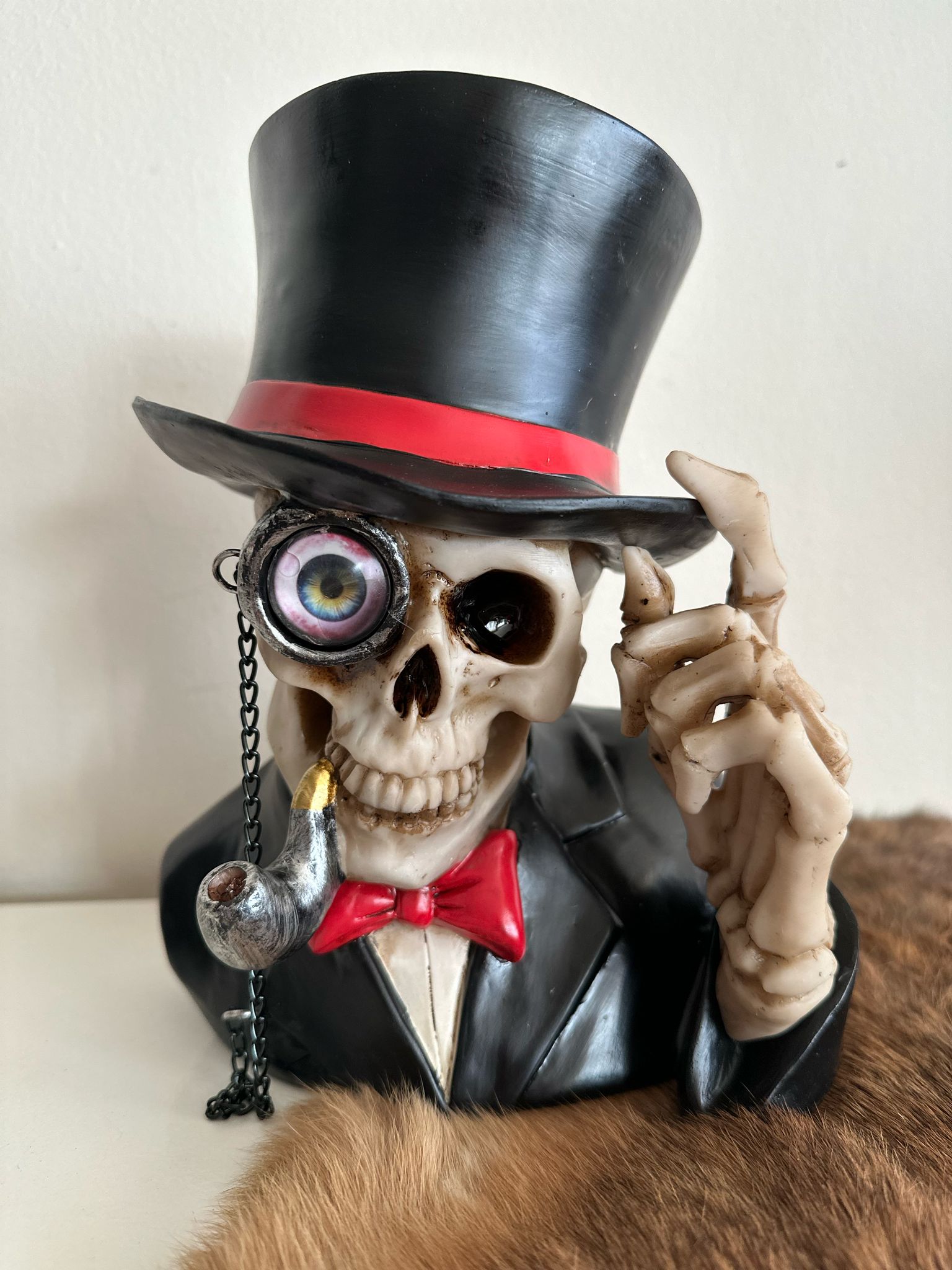 Deze indrukwekkende Skull met Hoge Hoed is een echte blikvanger voor liefhebbers van gothic, steampunk en alternatieve decoraties. De gedetailleerde schedel draagt een stijlvolle hoge hoed, wat hem een mysterieuze en elegante uitstraling geeft. Perfect voor op een boekenplank, bureau of als centerpiece in een mancave.