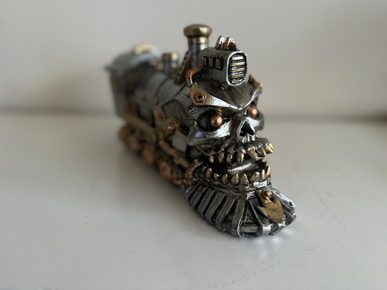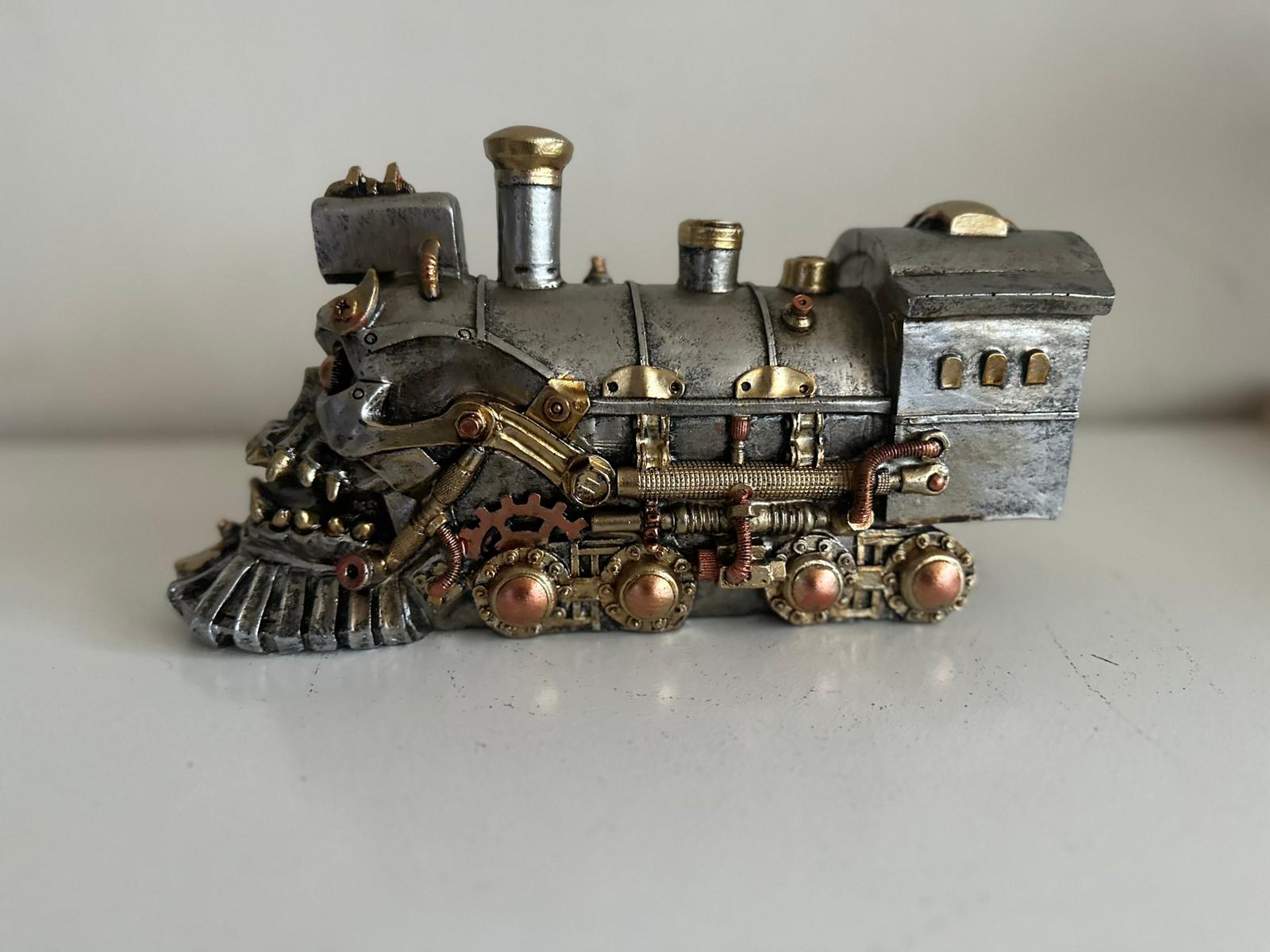 De locomotief is rijk gedetailleerd met verfijnde steampunk-elementen zoals tandwielen, buizen, klinknagels en mechanische accenten. De warme metallic tinten en zorgvuldige afwerking geven het geheel een luxe en authentieke uitstraling, alsof het rechtstreeks uit een alternatieve industriële wereld komt.